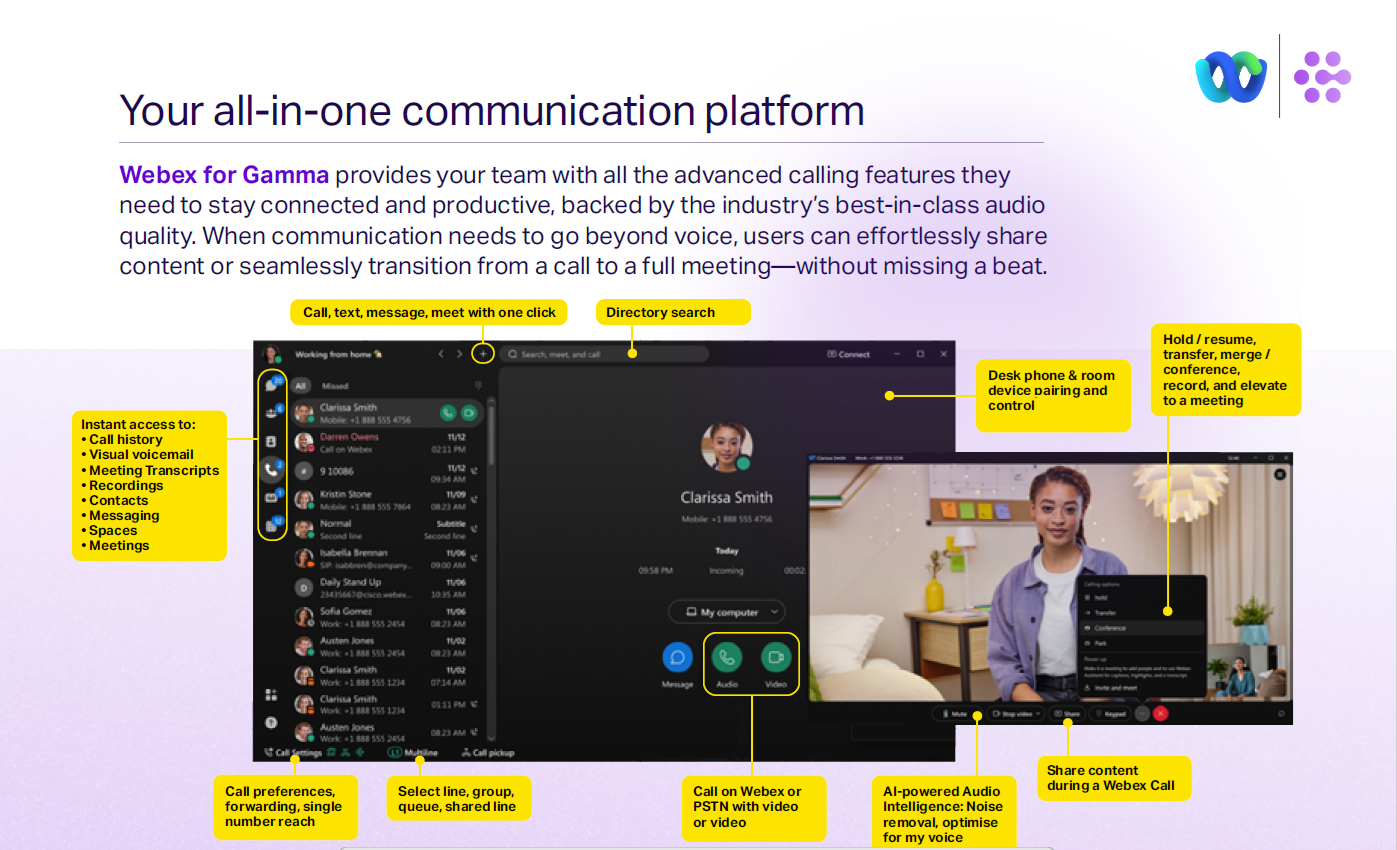 Designed for organisations looking to transition to all IP communications ahead of the PSTN switch off, Webex for Gamma offers a future ready architecture that streamlines operations, increases productivity and enhances customer experience.